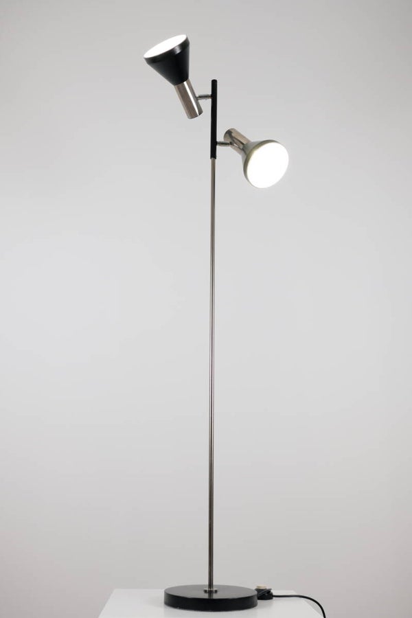 Vintage vloerlamp van Koch&Lowy uit de jaren70 voor OMI. Mid century modern lamp vervaardigd uit metaal en chroom. Lampen zijn apart te schakelen. Mooie aanwinst voor een vintage interieur.