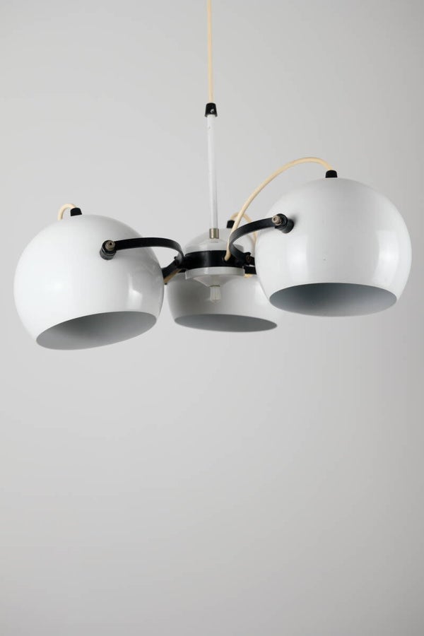 Prachtige vintage eyeball hanglamp uit de jaren zeventig, tijdloos wit en in uitstekende staat. De drie eyeballs kunnen in elke richting worden gedraaid. De eyeballs zelf hebben een doorsnee van 17 cm, hoogte is aan te passen.