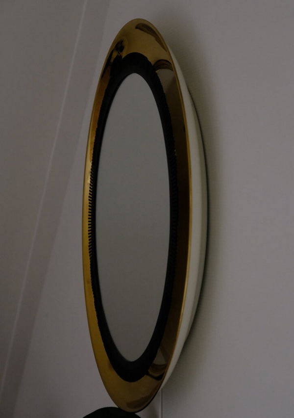 Zeldzame vintage mid century wandspiegel. Geproduceerd in Duitsland, jaren 70, bij de Vereinigte Werkstätten München. Deze prachtige spiegel is zowel direct of met een snoer op een stroompunt aan te sluiten. Een eyecather, vervaardig uit brass/messing met een zwart gekarteld metalen frame welke vooral bij verlichting, prachtige schaduwen creëert tegen het gouden messing. Authentiek, tijdloos, en in het echt mooier dan op de foto's.